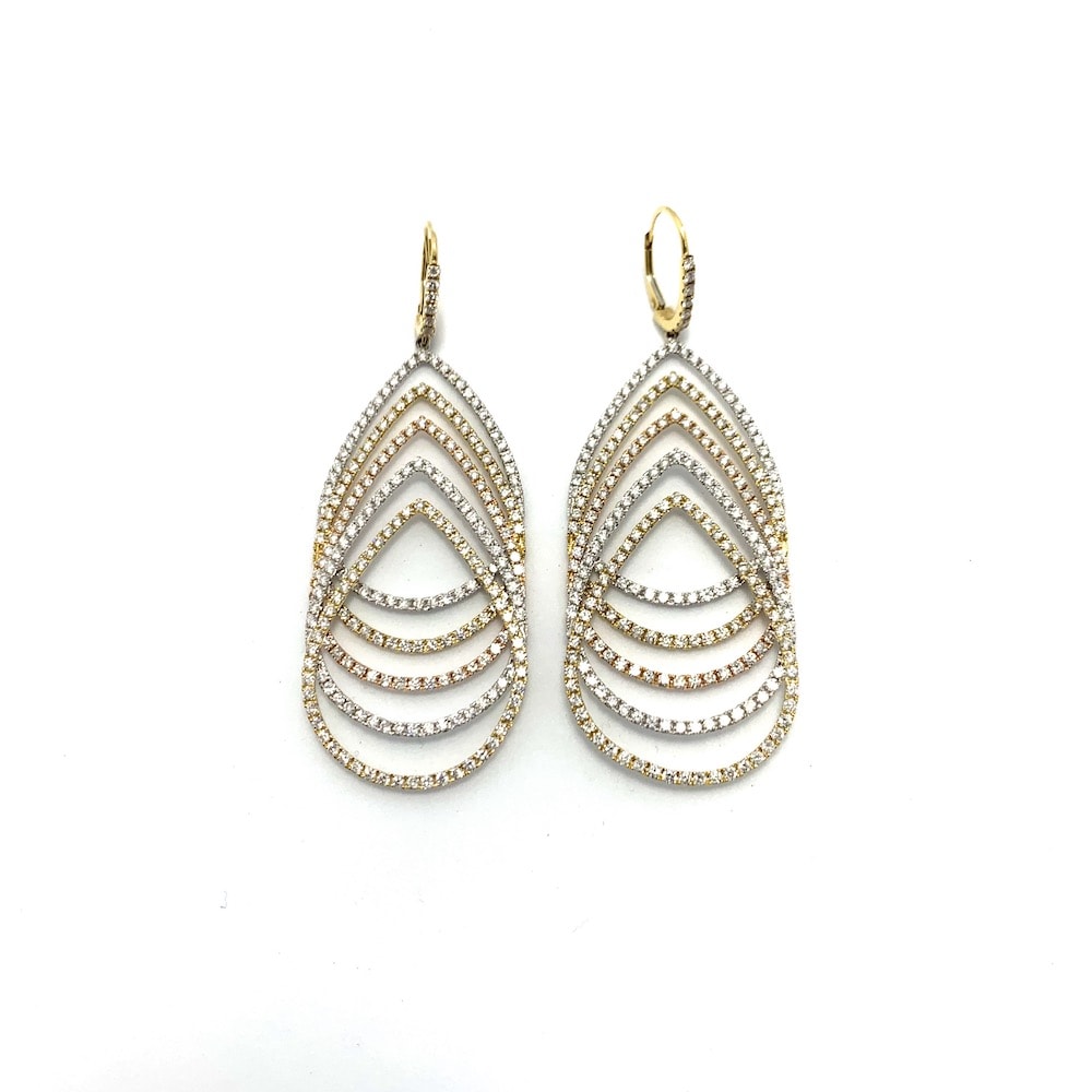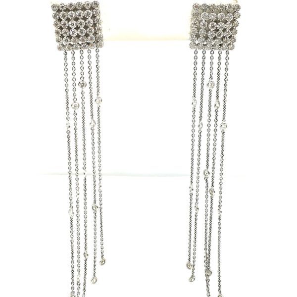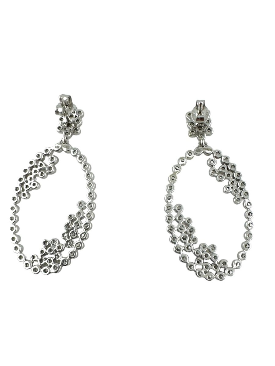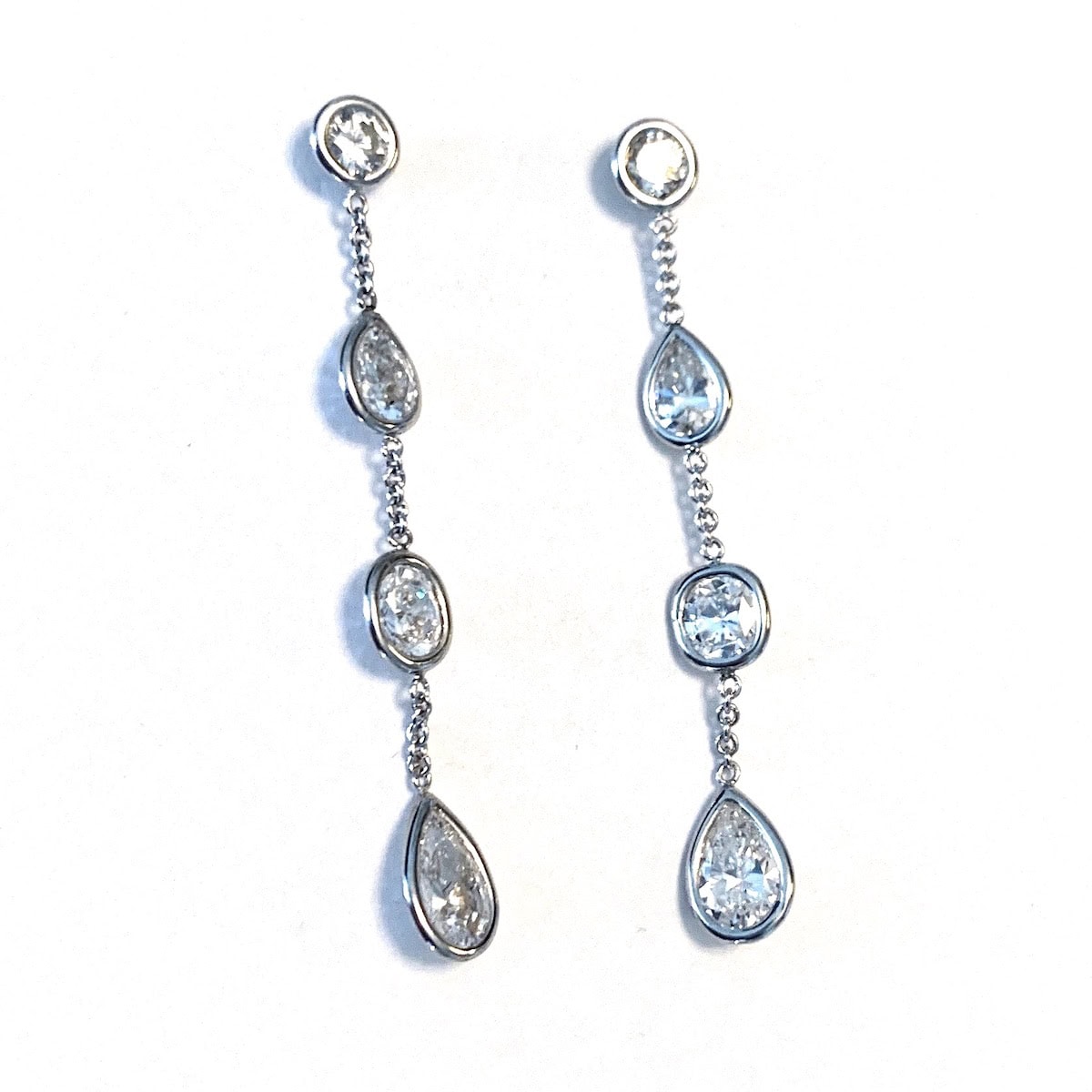 3.50 carats of pear-shaped, round, and oval diamonds bezel set in 14k white gold dangling earrings. You will love the movement of these earrings, and you're not likely to find another pair like them.