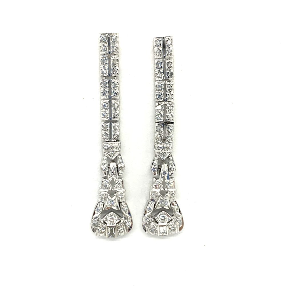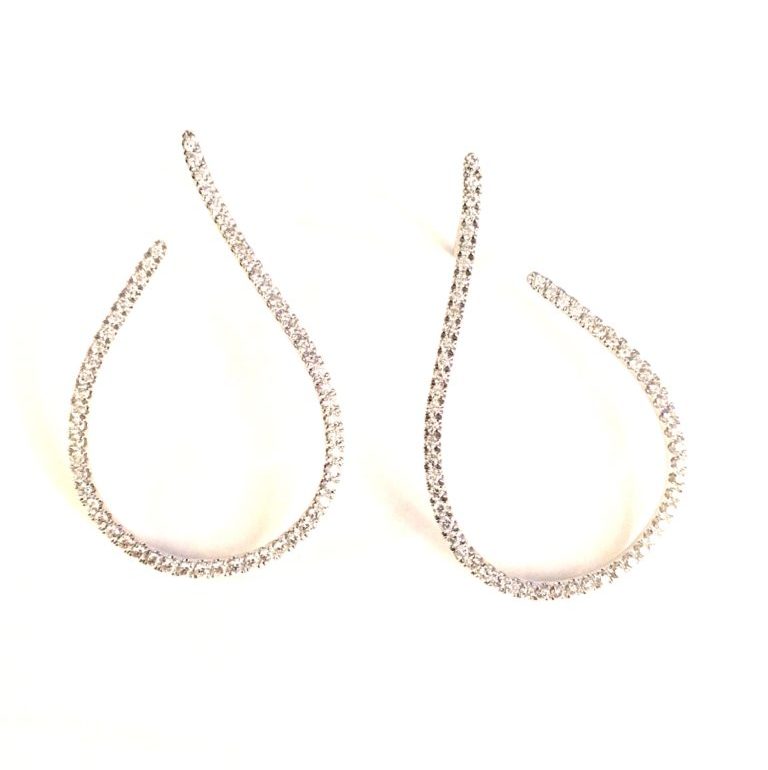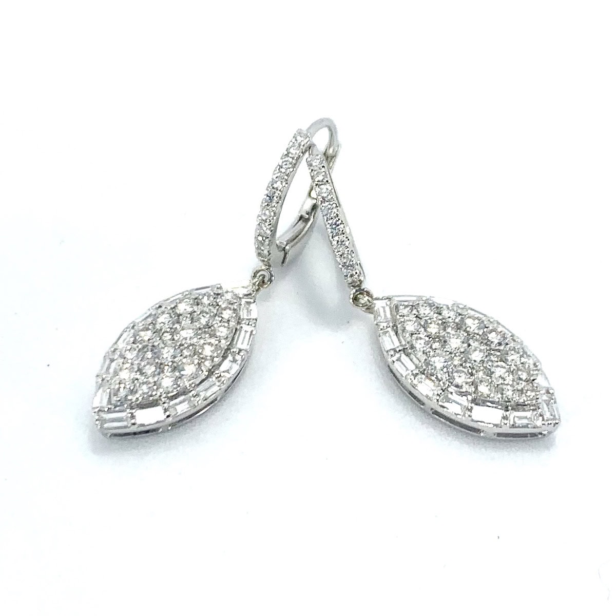 3.50 carats of pear-shaped, round, and oval diamonds bezel set in 14k white gold dangling earrings. You will love the movement of these earrings, and you're not likely to find another pair like them.
