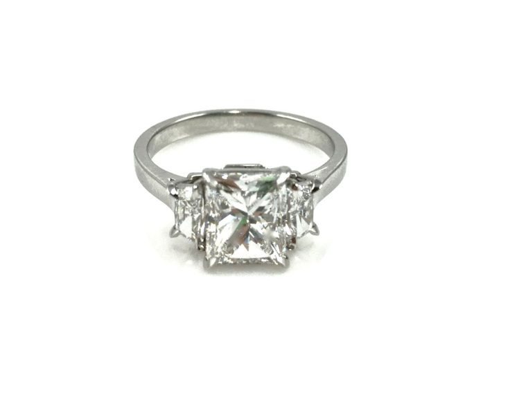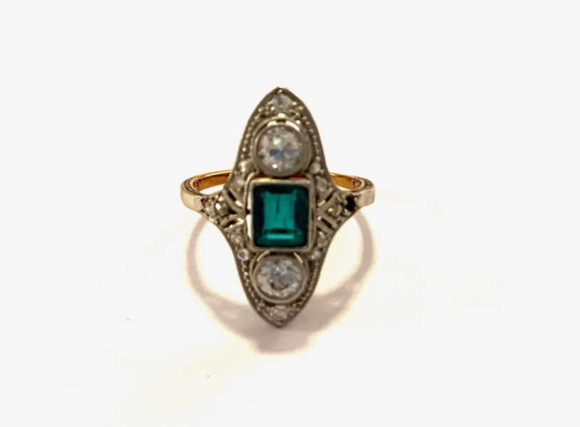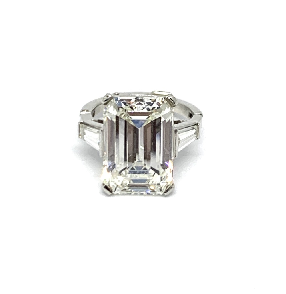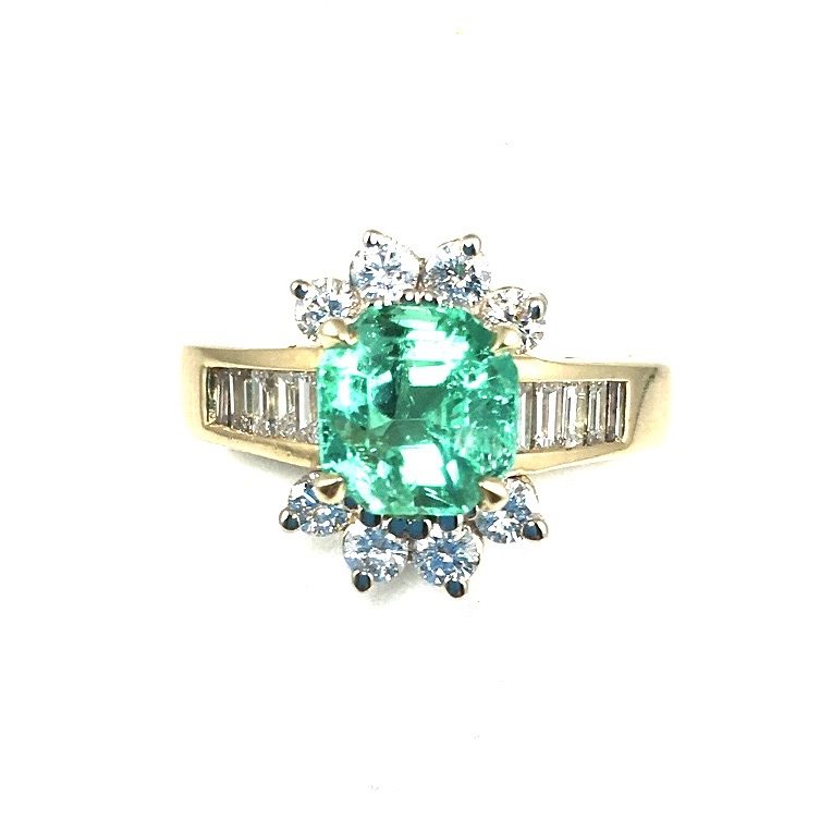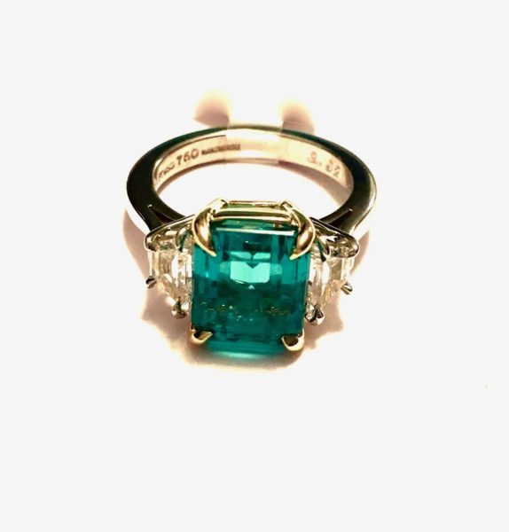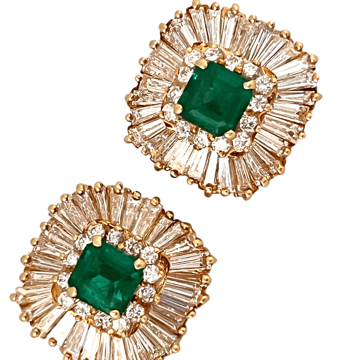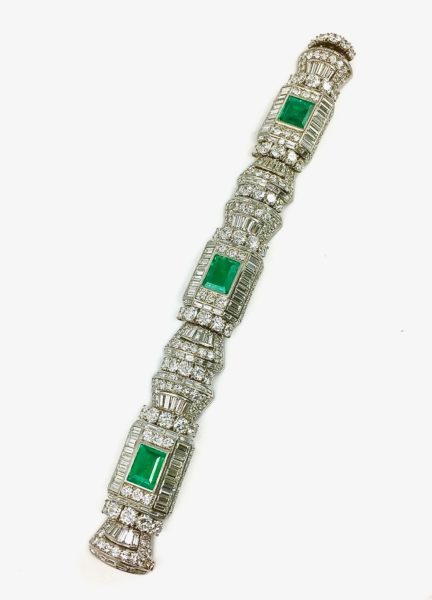 Two emerald cut emeralds @ approx 3.00 and 60 baguettes and 28 RBC’s @ 7.5 carats set in 18k yellow gold.