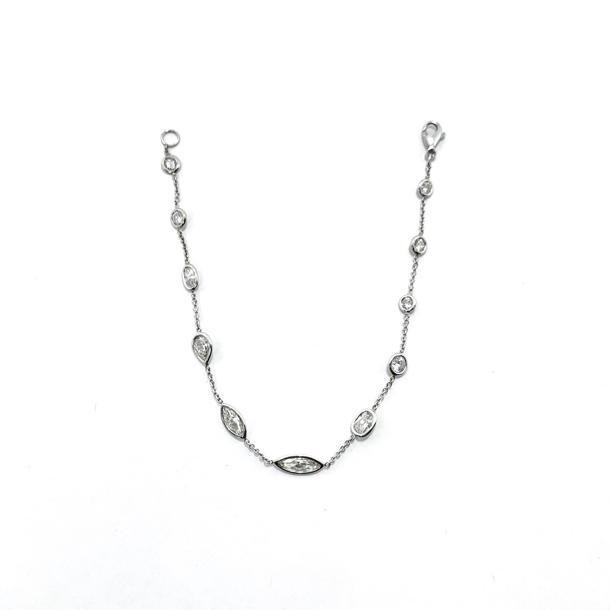 Set in 14k white gold bezels, this one-of-a-kind bracelet features 3.50 carats of round, oval, pear-shaped, and marquise cut diamonds. Bracelet is 7.5 inches and can be sized for any wrist.