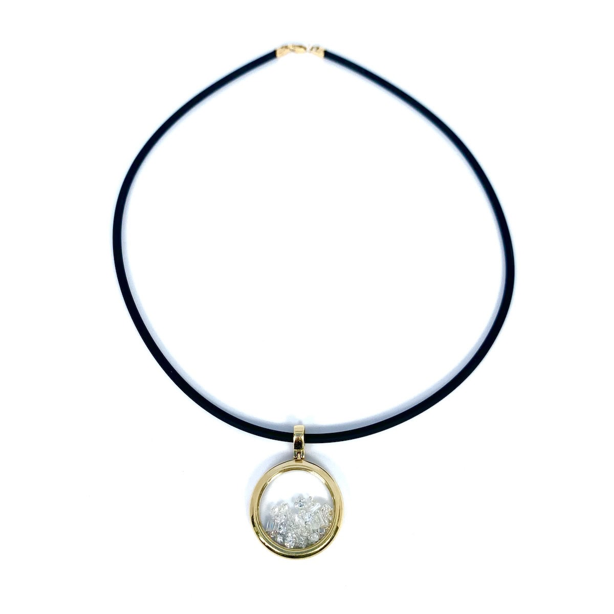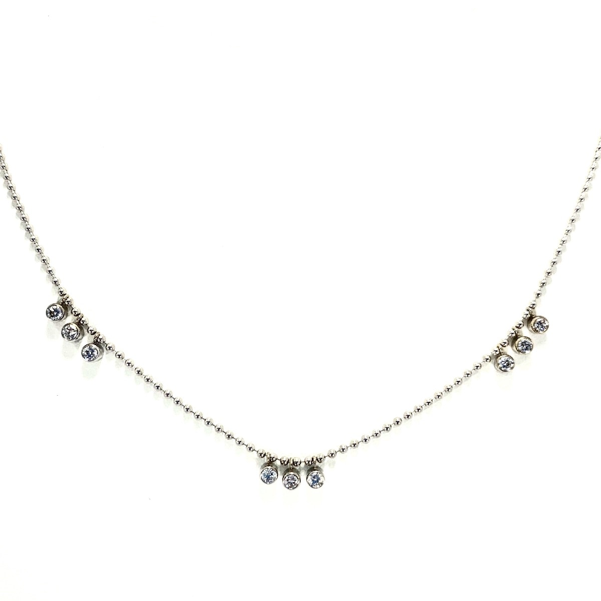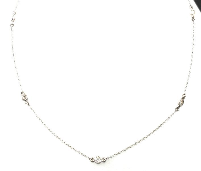 9 bezel set round brilliant cut diamonds weighing a total of 1.10 carats in 14k white gold suspended from a 1.5mm bead necklace.