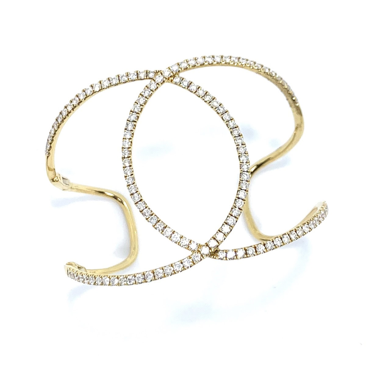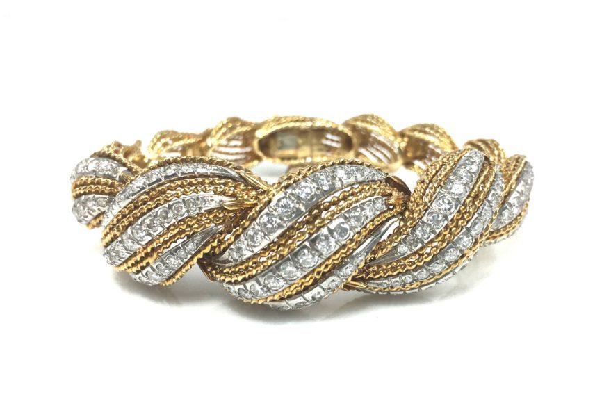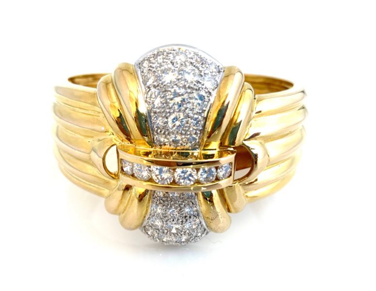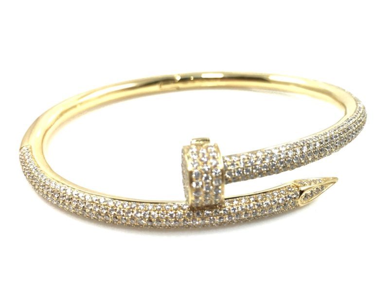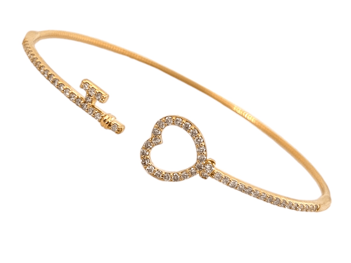 18k yellow gold heart and key flexible bangle bracelet with .65 carats of round brilliant cut diamonds.