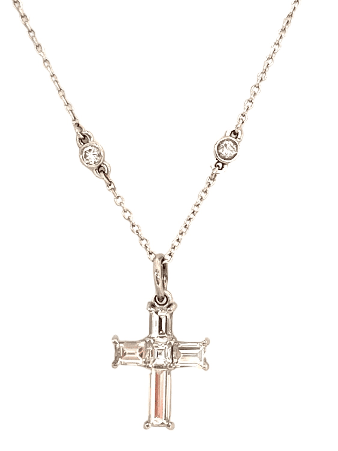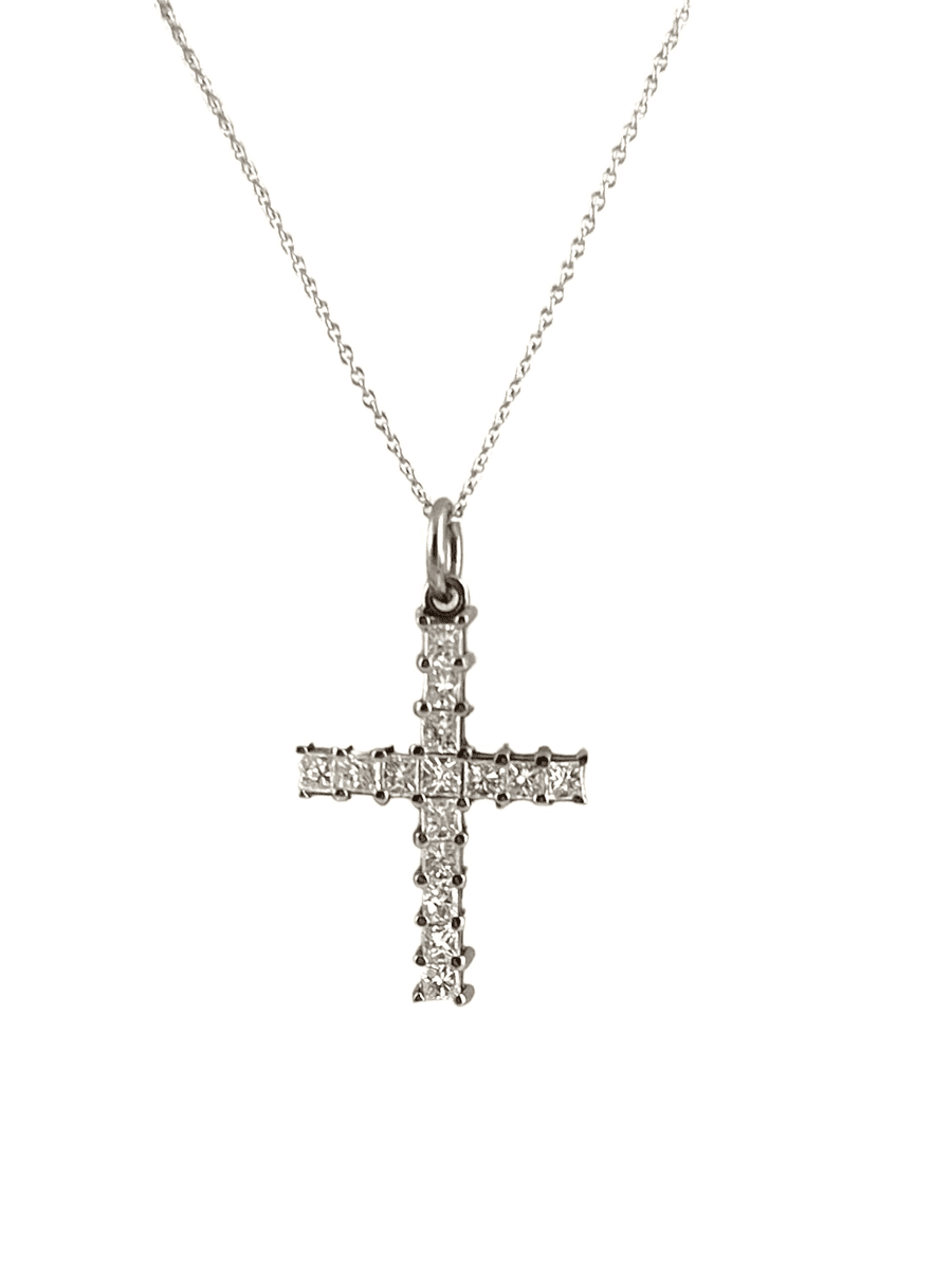 Impressive Princess Cut diamond cross pendant with 1.50 carats of diamonds set in 14k white gold, suspended from an 18” white gold chain. The necklace is brilliant and shines like the stars!