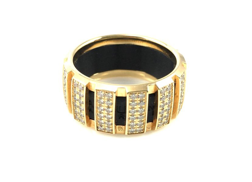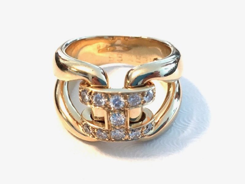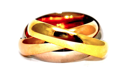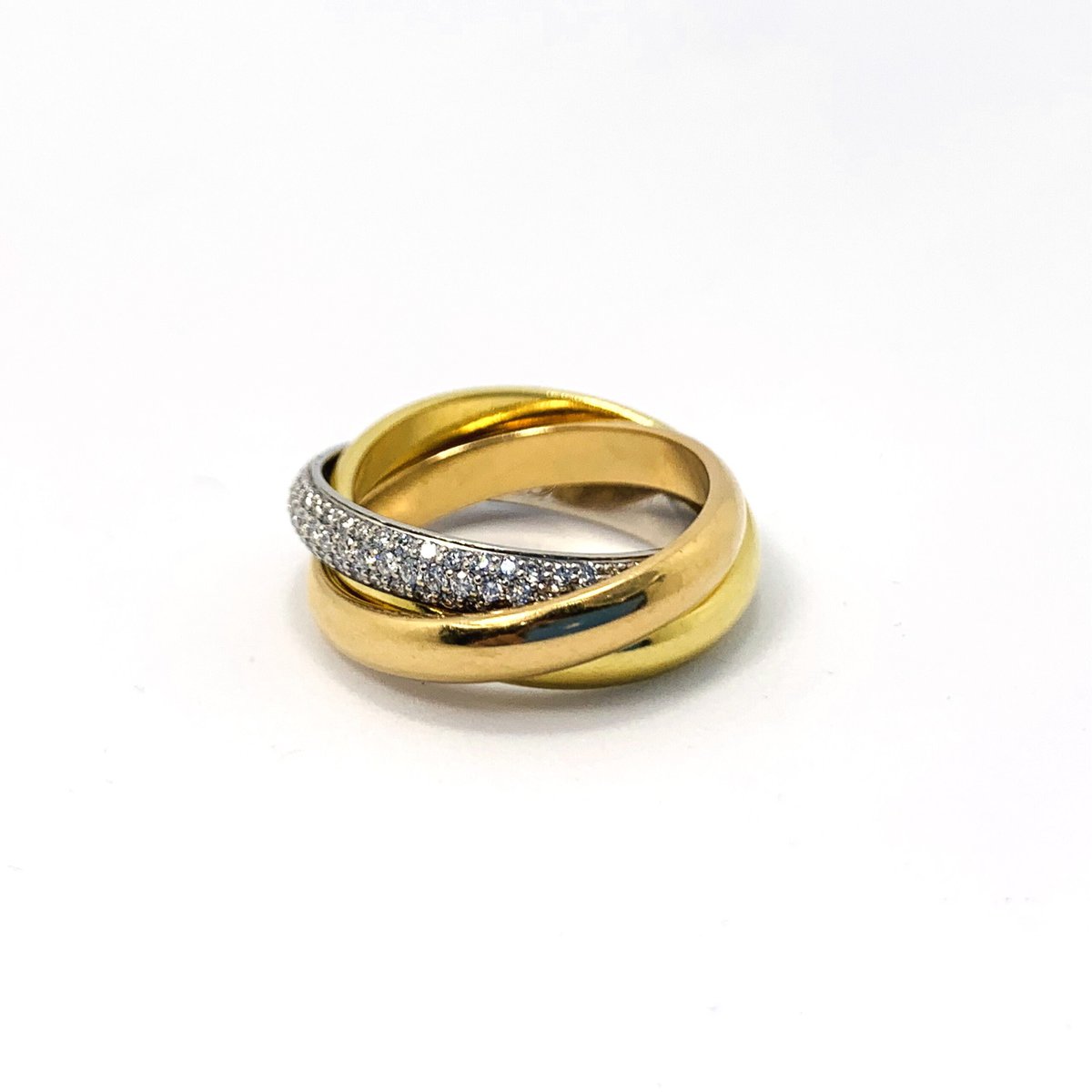 Cartier "Trinity" Ring comprised of 18k rose gold, yellow gold, and white gold rings. The center white gold ring is set with 1 carat of gorgeous diamonds.