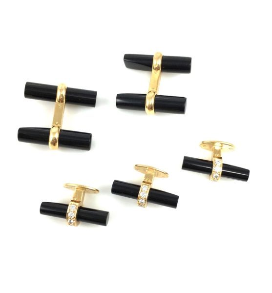 Lapis lazuli, estimated gross weight 18.5 grams, mounted in 18k gold with 18k gold, rose gold and white gold accents, signed Cartier, no. 686111, measures 7/8 x 1/4 in. Cufflinks with interchangeable bars.