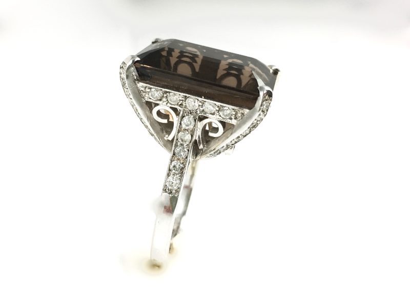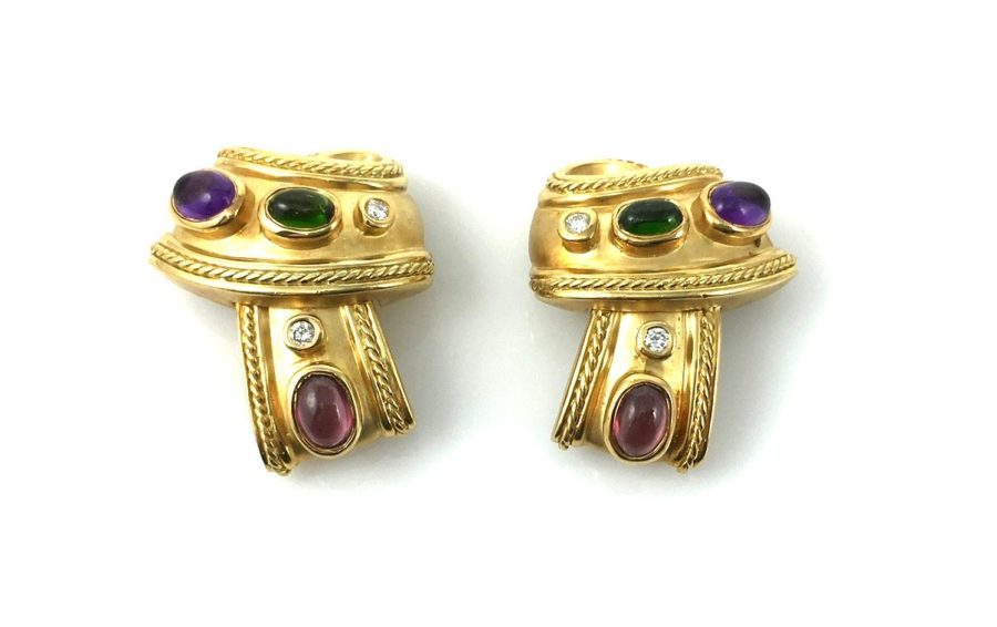 18k yellow gold bezel set semi-precious stones including yellow citrine, bicolor citrine, smoked citrine, ametrine, prasiolite, colored quartz, and transparent quartz.