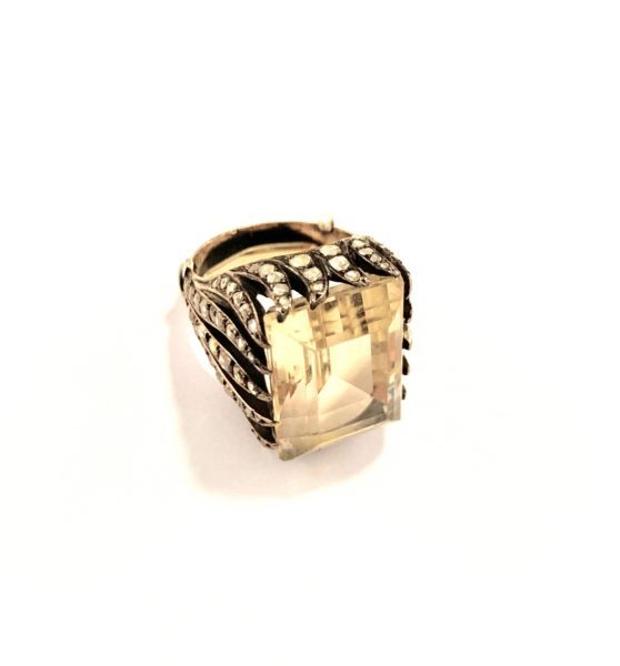 Signed Gadi, 18k w gold ring 6.8 dwt set with lemon quartz center and round tsavorites with .72 cts. diamond melee.