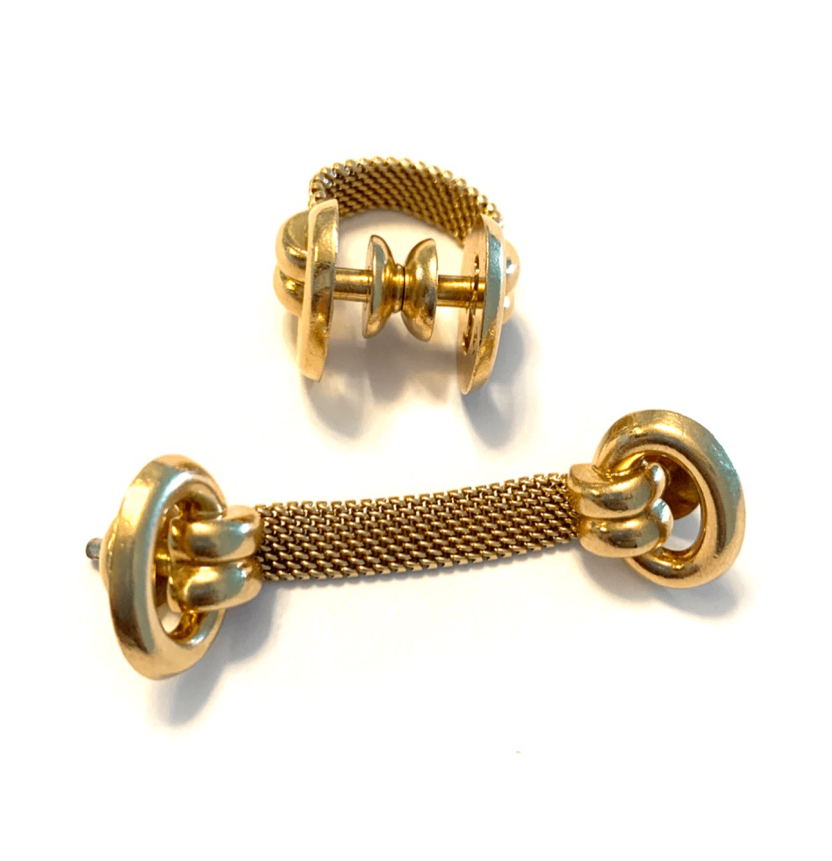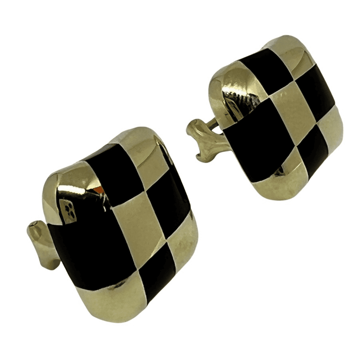 Signed "Marti" 14k yellow gold cuff links made with green and blue enamel basket weave design.